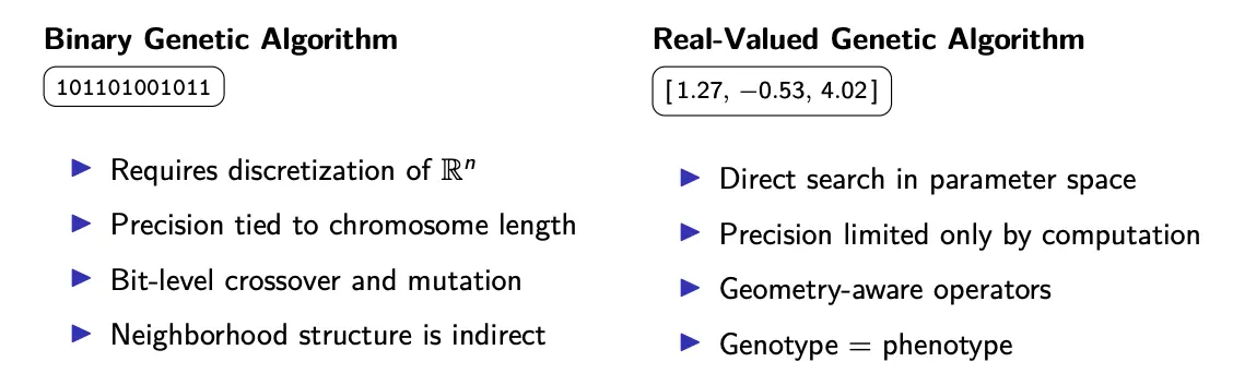 Many optimization problems are inherently continuous, where . In such problems, binary encoding introduces artificial discretization of a continuous space, and long chromosomes are needed to achieve acceptable precision. With real-valued GA, we can work directly in the problem’s native space.
