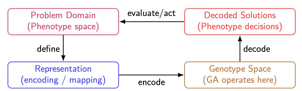 A standard way of doing encoding is with binary representation, where decision variables are represented as bit strings: