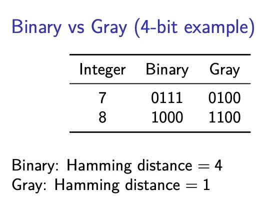 Gray coding is a representation designed to preserve neighborhood structure. Consecutive integers differ by exactly one bit, so Hamming distance better correlates with numeric distance.
