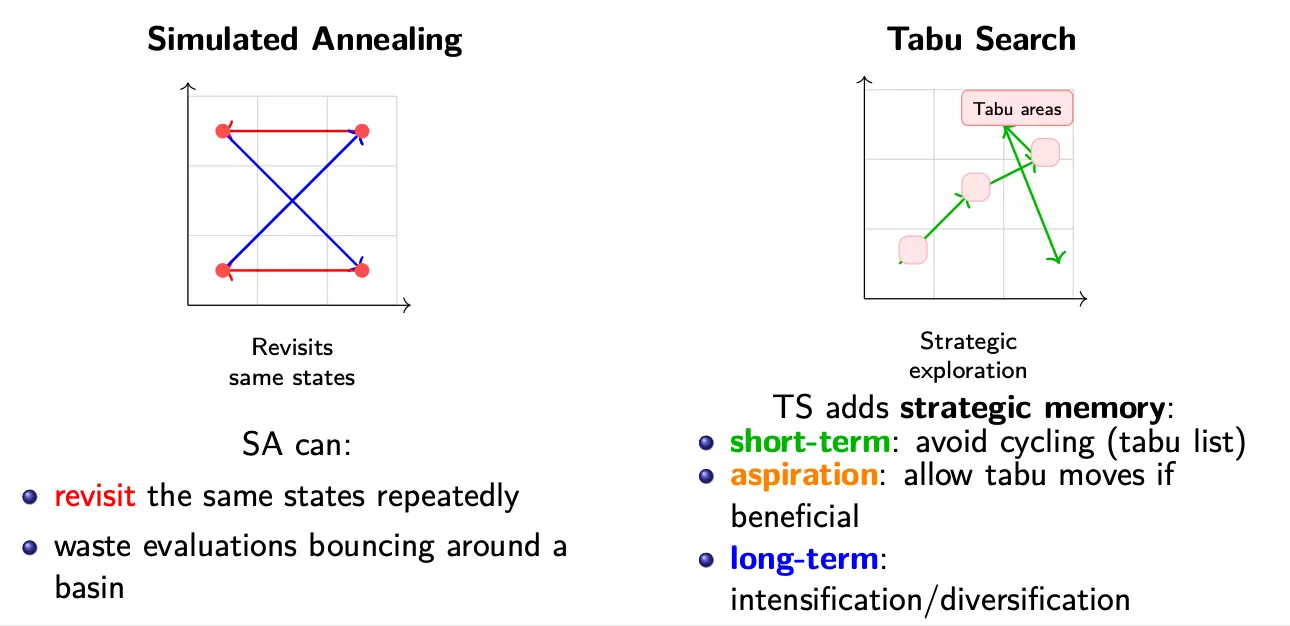 Tabu search is a memory-guided metaheuristic trajectory optimization method. With a memoryless method like simulated annealing, we run the risk of revisiting the same states repeatedly. On the other hand, TS is a metaheuristic for local search with adaptive memory; recently visited moves are declared tabu, preventing cycling and enabling escape from local minima.