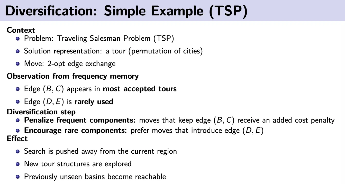 Then, we can do restart diversification by forcing rarely-used components and restarting search. Or, we can do continuous diversification, where we bias the move evaluation by adding a frequency-related term to the objective. We can also penalize solutions that are too close to the current solution.