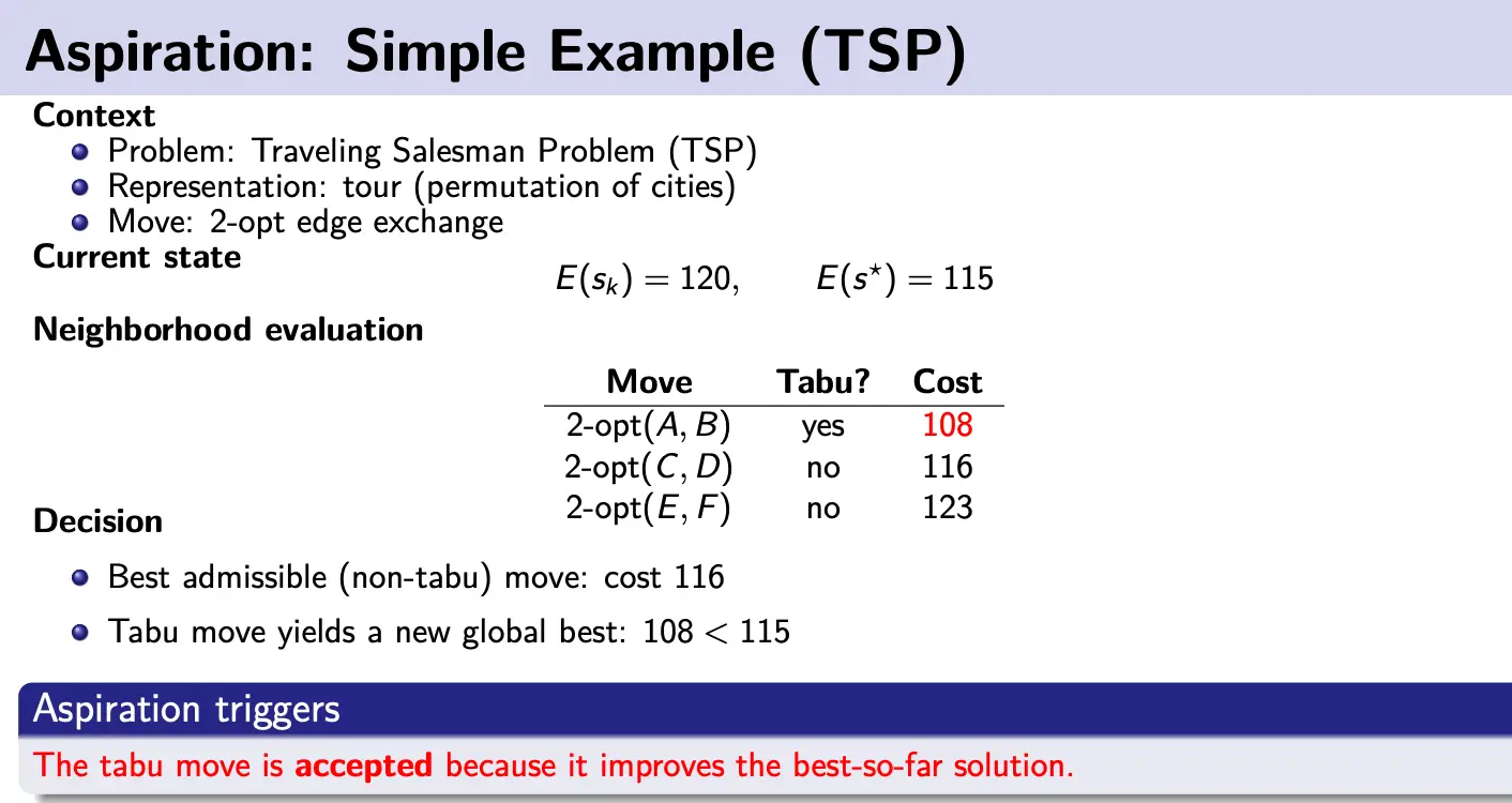 is the aspiration set that overrides the tabu list when a tabu move represents genuine progress. Tabu restrictions prevent cycling, but they may also block important improving moves; aspiration prevents tabu memory from becoming overly restrictive.