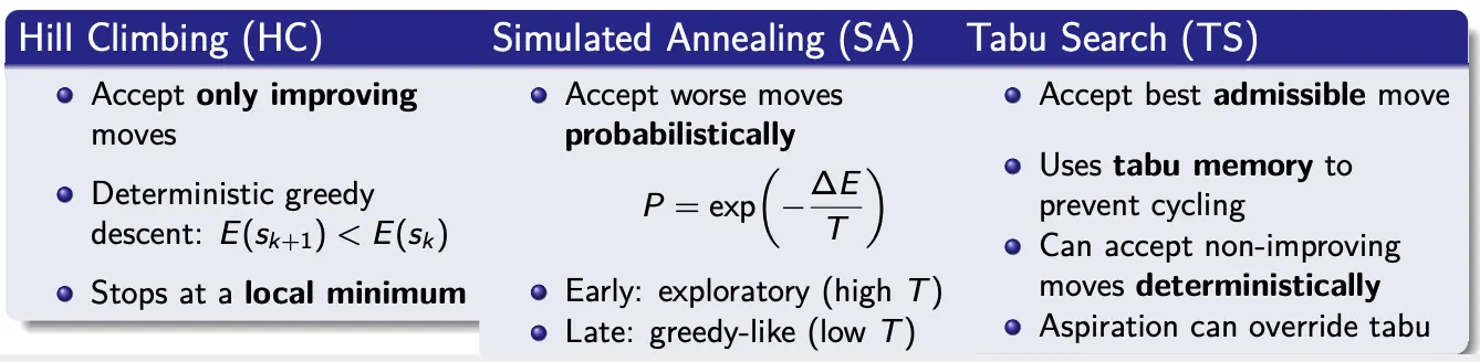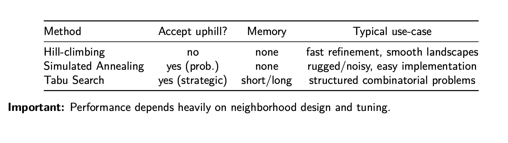 How do greedy descent, simulated annealing, and Tabu Search compare? All three use the same core components: State s Cost E(s) Neighborhood N(s)