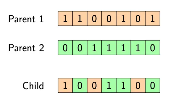 Uniform crossover is a simple crossover/recombination method for binary-representation genetic algorithms. We flip a coin for each gene and then select the gene from either parent based on the result.
