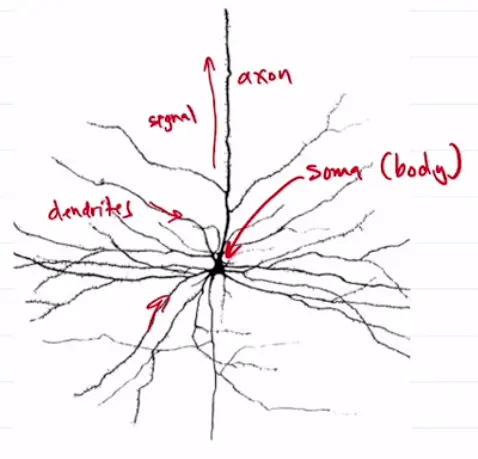 The body of the neuron is called the soma. Electrical signals generated by the soma travel up the axon. Electrical signals from other neurons are collected in the dendrites.