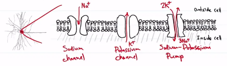 Sodium-Potassium pump: exchanges 3 Na+ ions inside the cell for 2 K+ ions outside the cell.