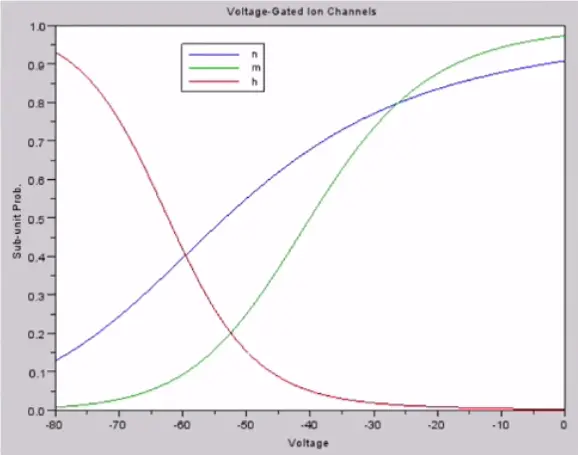 The fraction of Na+ ion channels open is , where are dynamic variables that depend on voltage. We have: