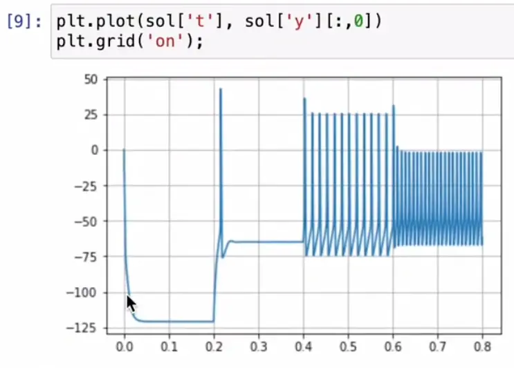 Intuitively, at a threshold voltage of around -55mV initiated by the input current coming from other neurons, the conductance of Na+ channels are expected to be active. The Na+ channels activations leads to the so-called depolarization phase, by pushing Na+ ions in the cell, which causes a sudden increase in the membrane potential (V). The Na+ channel becomes effectively inactive around the