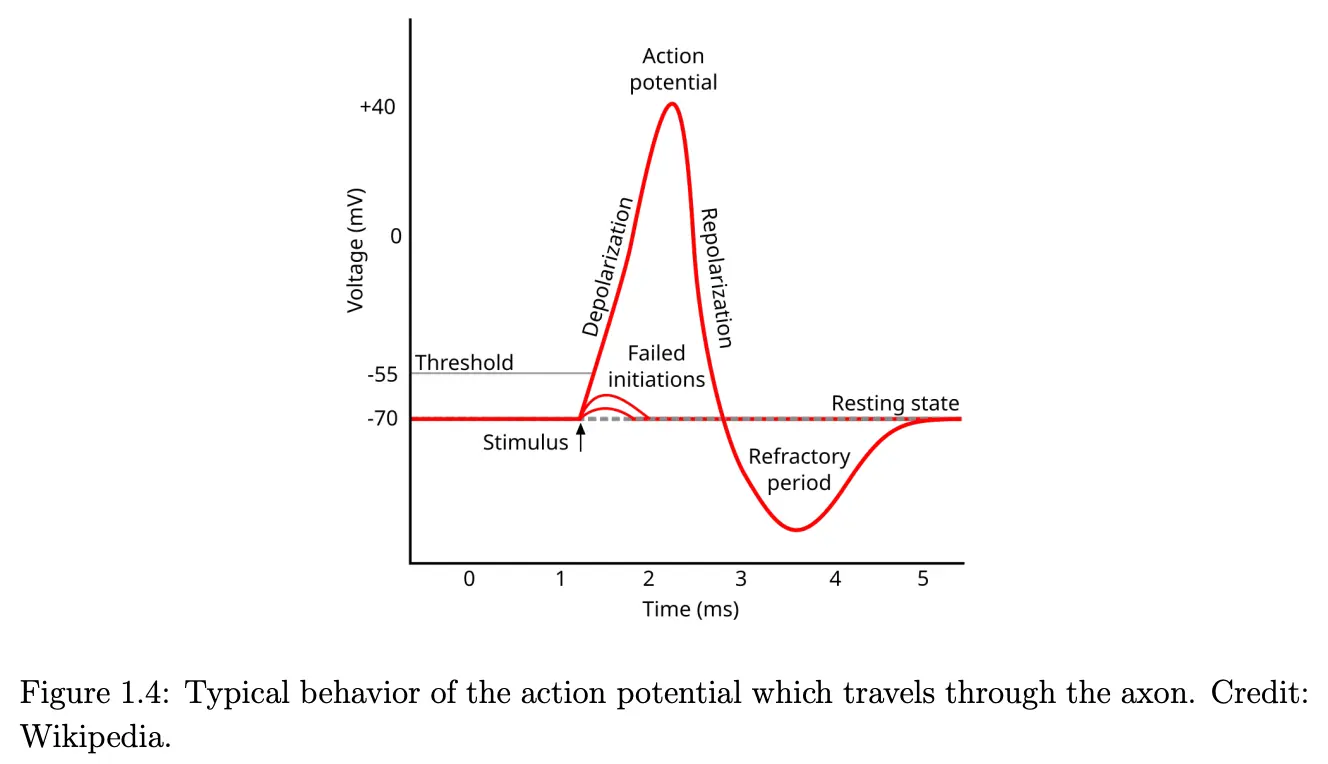 Neurons have a peculiar behaviour: they can produce a spike of electrical activity called an action potential. This electrical burst travels along the neuron’s axon to its synapses, where it passes signals to other neurons. Synapses are where the axons of one neuron interacts with the dendrites of another neuron.