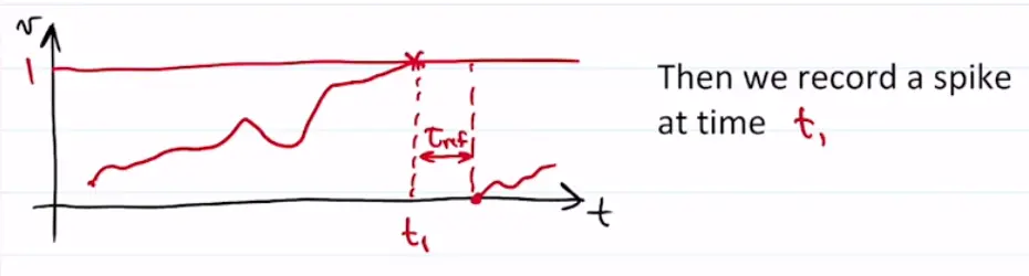 We integrate the differential equation for a given input current (or voltage) until reaches a threshold value of . At this point we record a spike. After it spikes, it remains dormant bit for (refractory period), and then we start integrating again from zero.