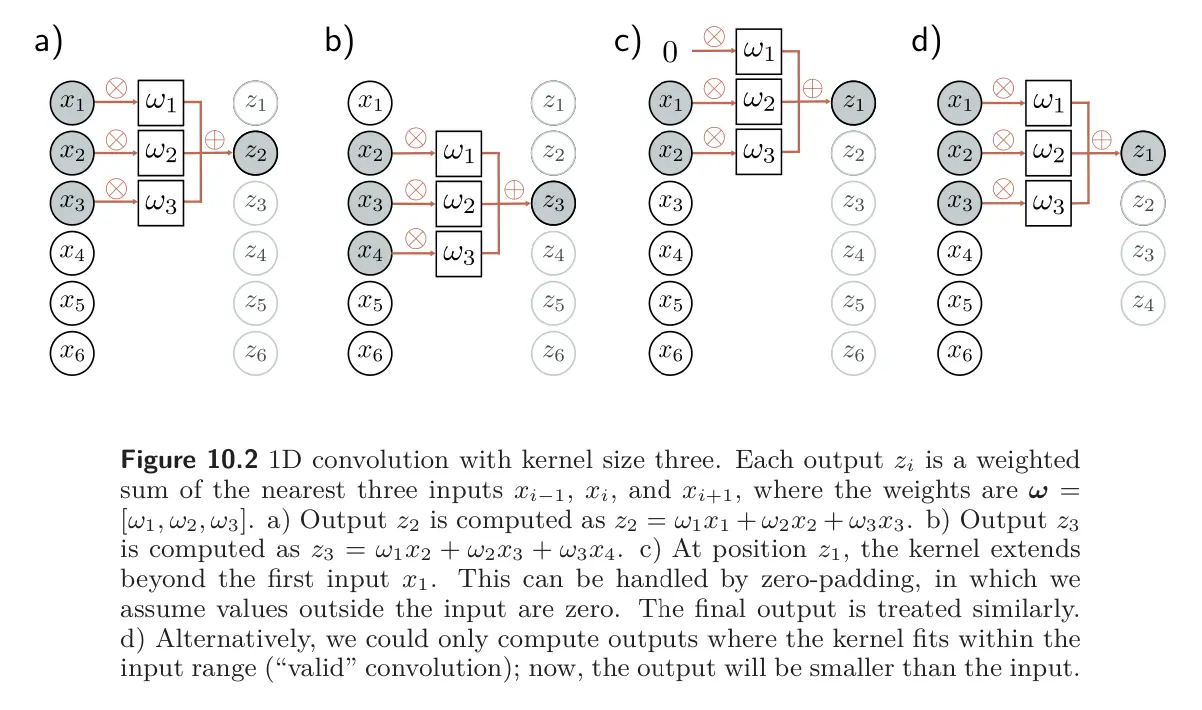 As we saw from the equation above, each output is computed by taking a weighted sum of the previous, current, and subsequent positions in the input. Then, how do we deal with the first output, where there is no previous input? How do we deal with the final output, where there is no subsequent input?