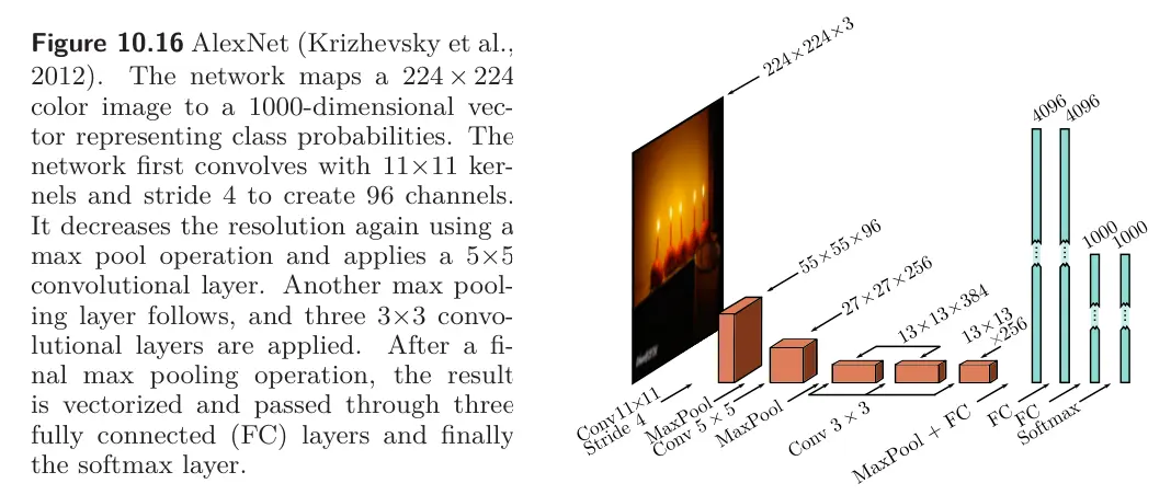 AlexNet was the first convolutional network to perform well on ImageNet, which is a 1000-class image classification task. It consists of eight hidden layers with ReLU activation functions, of which the first five are convolutional and the rest are fully connected.