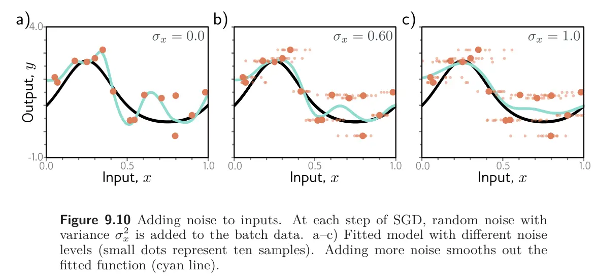 Add noise to input data: This smooths out the learned function. For regression problems, it can be shown (Problem 9.3) to be equivalent to adding a regularizing term that penalizes the network’s output with respect to its input. An extreme version of this is adversarial training.