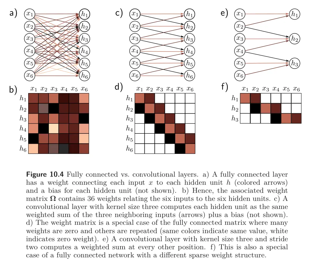 If there are inputs and hidden units , this fully connected layer would have weights and biases . The convolutional layer only uses 3 weights and 1 bias. A fully connected weight can reproduce this if most weights are set to zero and others are constrained to be identical.
