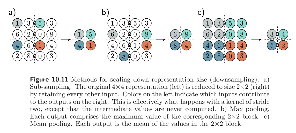Let’s say we want to scale down by dimensions by a factor of 2. The easiest way to scale down is sub-sampling: sampling every other position. When we use a stride of two, we are effectively using this method simultaneously with the convolution operation.