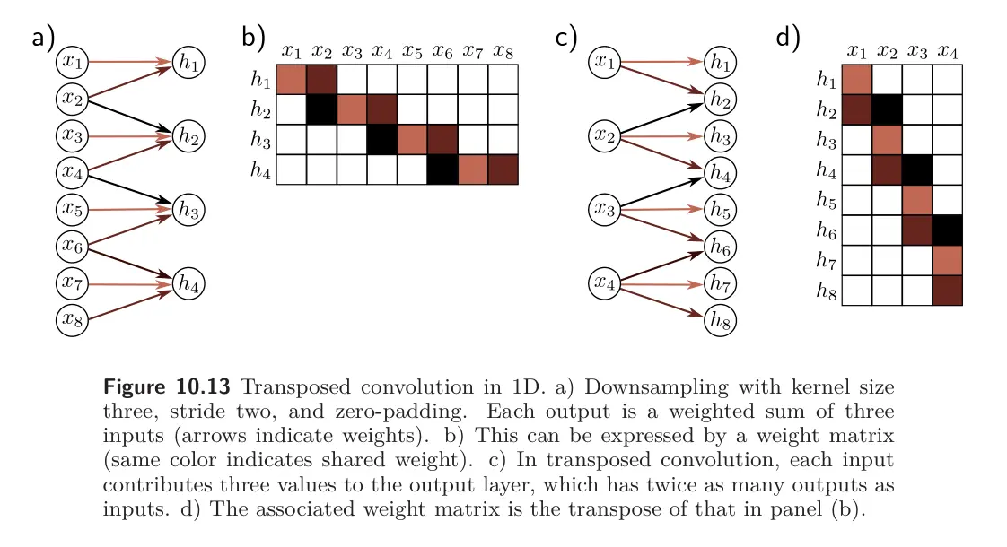 - A fourth approach is roughly analogous to downsampling using a stride of two. In that method, there were half as many outputs as inputs, and for kernel size 3, each output was a weighted sum of the three closest inputs. In transposed convolution, we reverse this. There are twice as many outputs as inputs, and each input contributes to three of the outputs. When we consider the associated weight matrix of this upsampling mechanism, we see that it is the transpose of the matrix for the downsampling mechanism.