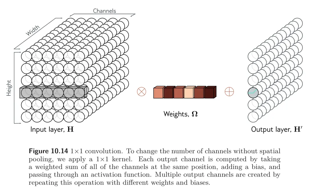 Sometimes we want to change the number of channels between one hidden layer and the next without further spatial pooling. This is usually so we can combine the representation with another parallel computation (like a residual). To accomplish this, we apply a convolution with kernel size one. Each element of the output layer is computed by taking a weighted sum of all the channels at the same position. We can repeat this multiple with different weights to generate as many output channels as we need. The associated convolution weights have size , hence this is a convolution. Combined with a bias and activation function, this is equivalent to running the same fully connected network on the input channels at every position.