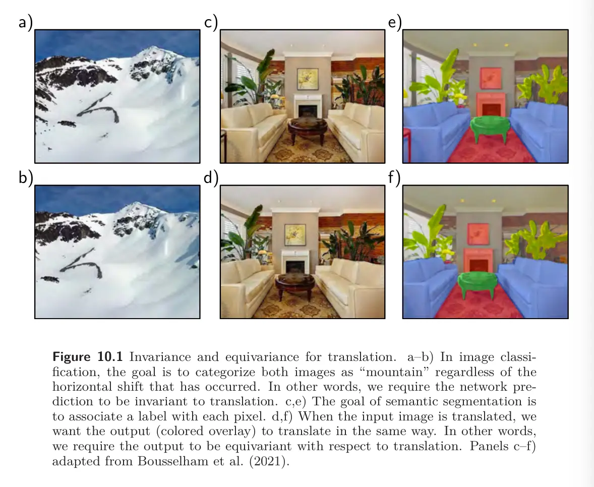 such that its output changes in the same way under the transformation as the input. Networks for per-pixel segmentation should be equivariant to geometric transformations. If the images is translated, rotated, or flipped, the network should identify an image as containing the same object, even if it has been translated, rotated, flipped, or warped.