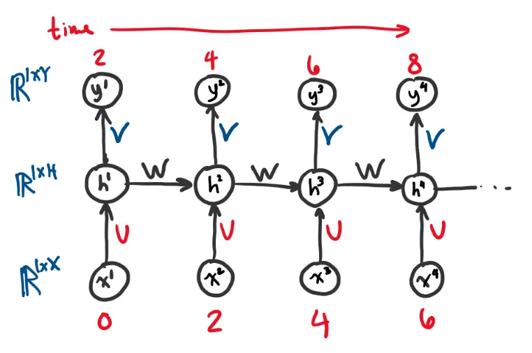 At each time step , the hidden state is updated using the previous hidden state and the current input.
