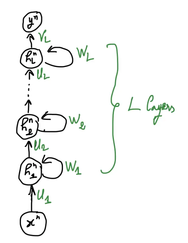 The key idea is that we have multiple layers of hidden states instead of a single hidden hidden state per timestep. Each layer processes information before passing it to the next layer.