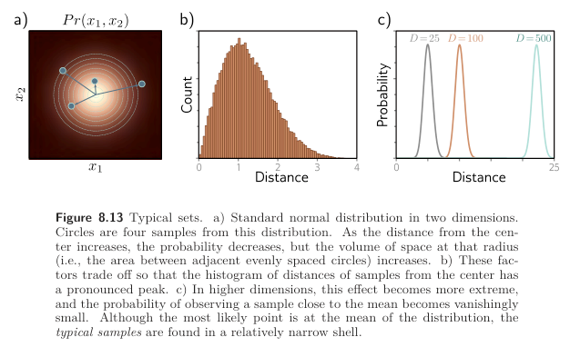 Figure 8.13c shows the distribution of distances of samples of a standard normal distribution as the dimension increases. Empirically verify this finding by sampling from the standard normal distributions in 25, 100, and 500 dimensions and plotting a histogram of the distances from the center. What closed-form probability distribution describes these distances?