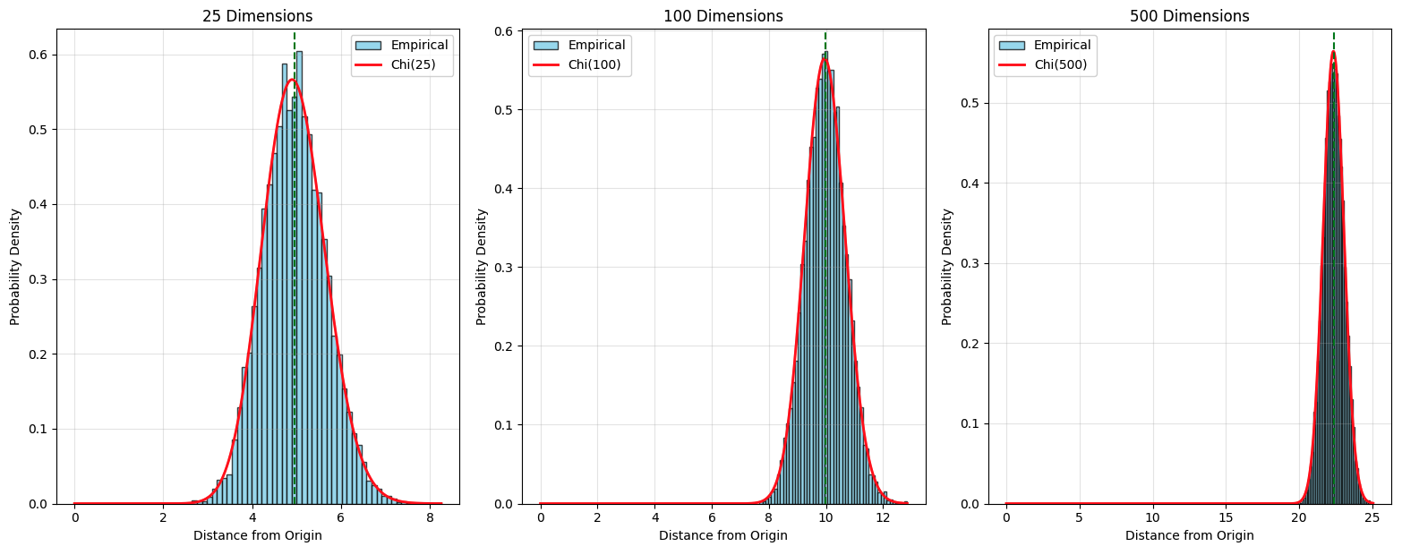 The distances from the origin of samples from standard normal distributions follow a Chi distribution with degrees of freedom equal to the number of dimensions.